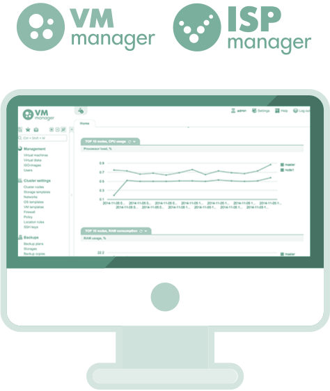 Удобная панель управления виртуальным сервером VMmanager позволяет вам осуществлять основные операции с сервером, такие как перезагрузка, остановка, переустановка ОС прямо из браузера. Вам так же доступна возможность загрузить свой образ ISO и установить ОС из него.